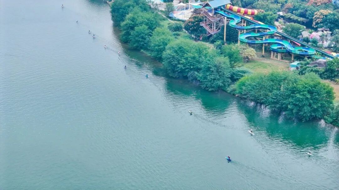 选手的桨板划过,激起的涟漪打破水面的平静,将城市的活力与自然的静谧完美融合。枝叶繁茂形成天然绿荫,既能感受赛事的激情,也能享受江风的凉爽。