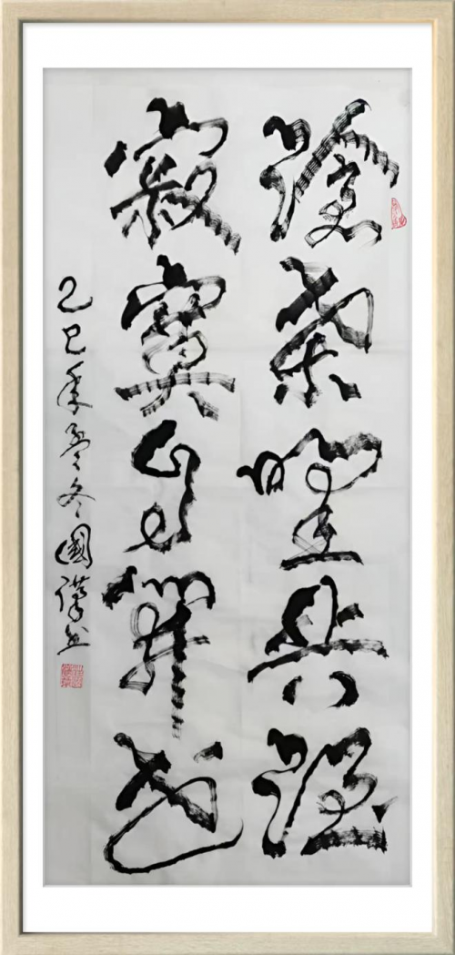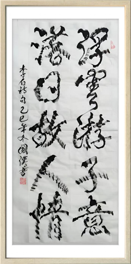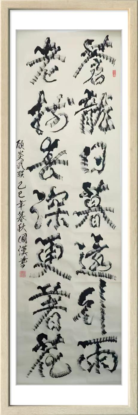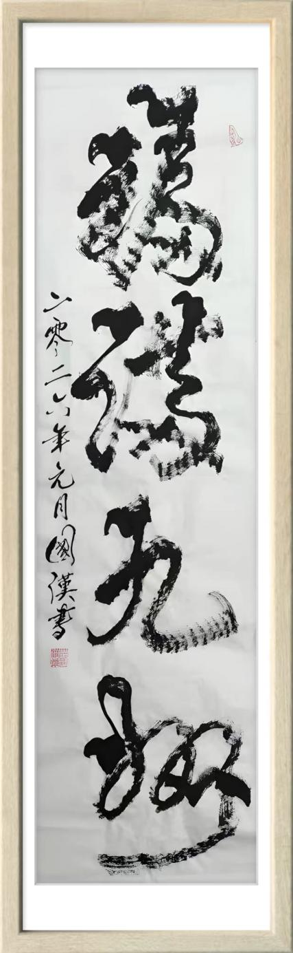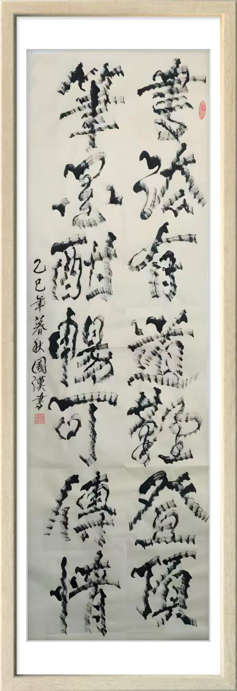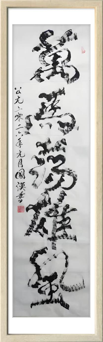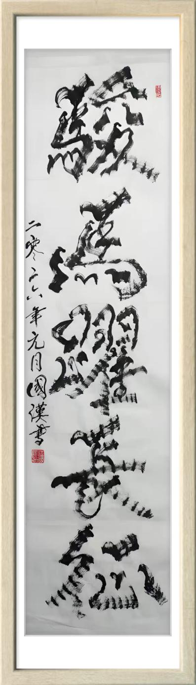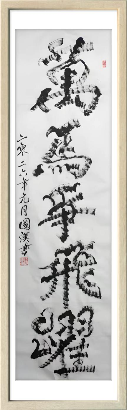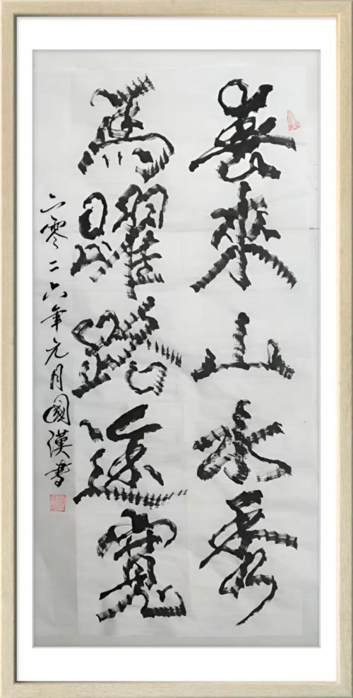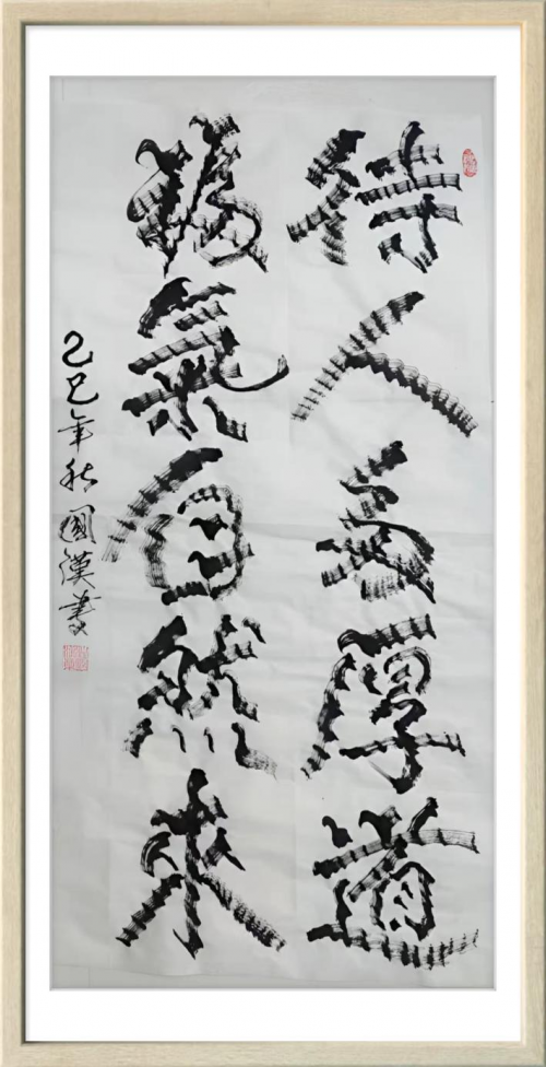 汪国汉以笔为弦,以墨为韵,在宣纸的寂静舞台上演奏着一曲曲线条的交响诗。他的“柳曲锯齿型”书法不仅是形式语言的突破,更是对书法本质的深度追问与对生命存在的诗意表达。那些游走于纸上的猫尾,锯齿,竹节,枯枝,链条,山峦,波浪,飞鸟已然超越了简单的形态模仿,升华为书家心灵图景的象征与生命律动的轨迹。在人人言创新而创新往往流于表面的时代,汪国汉以其扎实的实践与系统的思考,为我们展示了一条更为深刻,更为持久的创新之路。他始于对传统最深处的理解,成于对自然最细微的观察,终于对自我最真诚的表达。他的书法世界,邀请我们重新思考线条的无限可能,重新发现笔墨的当代生命,也重新定义书法艺术在今天的文化价值与美学意义。这或许就是汪国汉留给我们这个时代最珍贵的艺术启示。