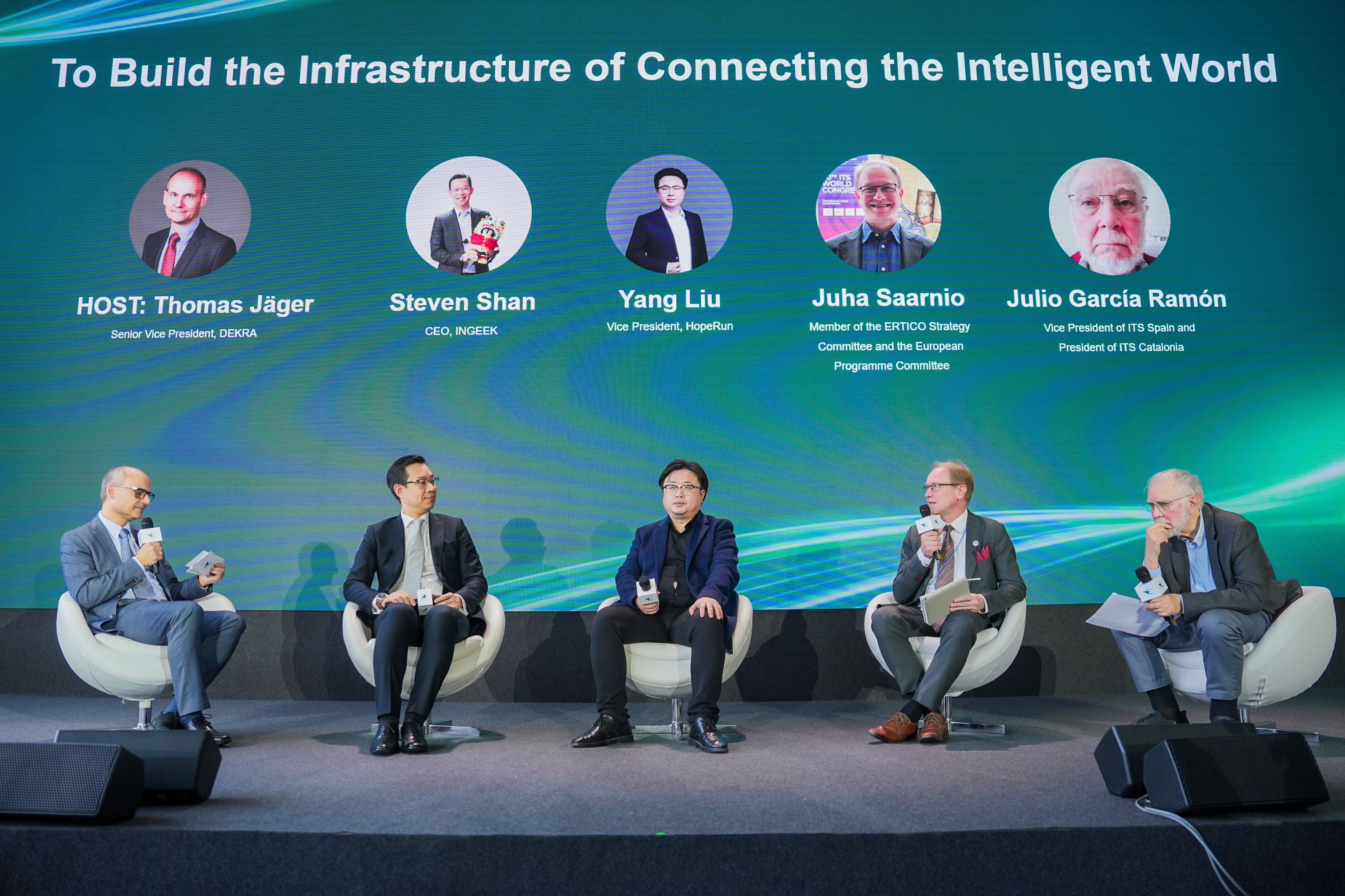 论坛最后,在德凯高级副总裁Thomas Jäger的主持下,一场汇聚全球智慧的圆桌讨论精彩上演。来自银基科技、润和软件、欧洲智能交通协会战略委员会及西班牙智能交通协会的嘉宾们,围绕构建智能世界的连接基础设施展开了深度对话与思想碰撞。