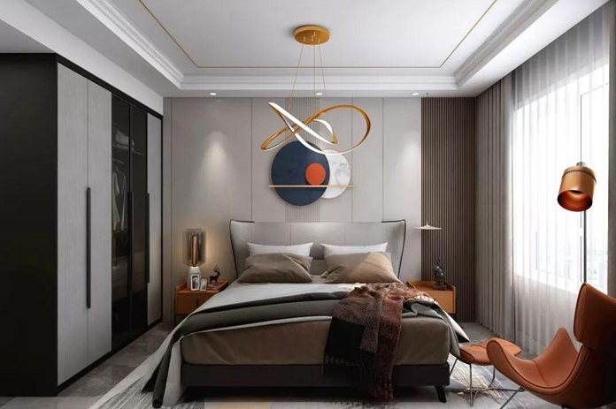 卧室以极致简洁和舒适为基调,暖色调与复古样式的灯饰、挂画相得益彰,营造出温润而沉静的氛围。舒适的床品如同温柔的怀抱,让身心得到充分的放松。次卧延续了整体风格,沉稳中带着一丝乌托邦式的梦幻。简约的设计让空间更加通透,没有多余的装饰,却尽显静谧雅致。色彩搭配和谐统一,材质运用精致高级,各种饰品的艺术属性为生活点缀出一个个美好时刻。