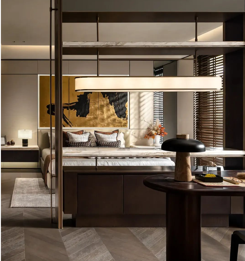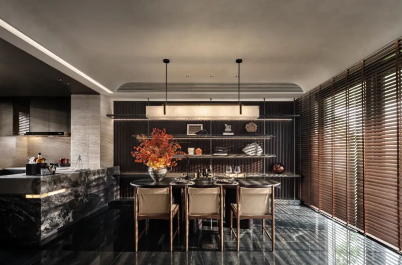 在这个空间里,光线是灵动的精灵。它从窗户洒入,在地面、墙壁上跳跃,与低饱和度的色彩相互映衬,勾勒出空间的轮廓,又赋予其动态的美感。茶室中,定制茶壶宛如一颗璀璨的明珠,吸引着人们的目光。柔和色调中融入的大理石与金属元素,让茶室更具魅力。此住宅实现了实用主义和美学的共存。柔和的自然光,与温润木材、洞石和不锈钢相互碰撞,营造出克制且从容平静的空间氛围。