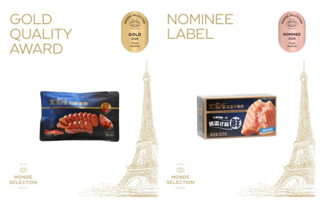 近日,世界品质评鉴大会(Monde Selection,简称“蒙特奖”)公布2026年度获奖名单,王家渡两大爆品再创佳绩——川味香肠斩获国际蒙特奖·金奖,亦是中国川味香肠首次问鼎这一国际权威奖项,以硬核品质向世界展示中国川味食品的卓越水准。